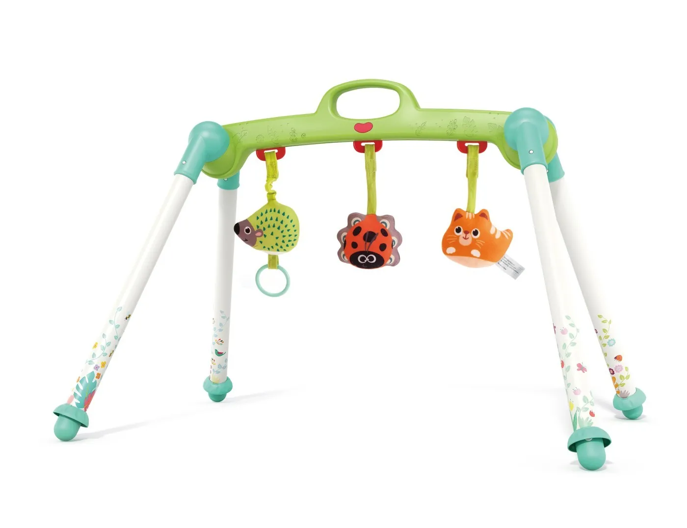 Este fabricat din material ABS si plastic durabil si de inalta calitate. Este complet sigur pentru copii. Aceasta jucarie este pentru intarirea muschilor bebelusilor si este o jucarie pentru baieti si fete. Are o baza asemanatoare cu baza unui leagan. Pliabil pentru transport usor.Poate fi folosit in 3 pozitii culcat pe spate, asezat si culcat pe burta. Prezinta 3 jucarii de plus un arici, o buburuza, o pisica.