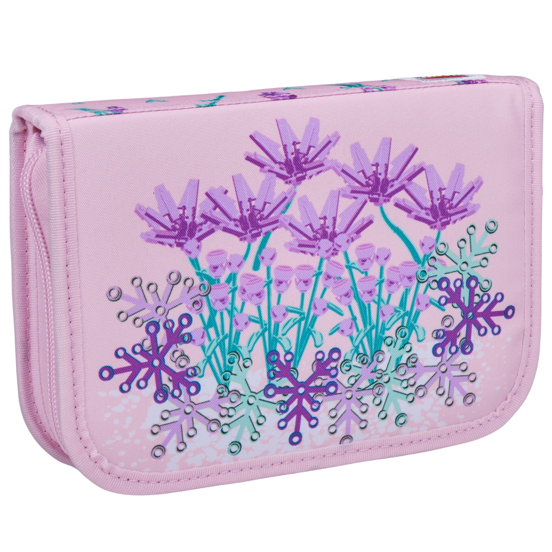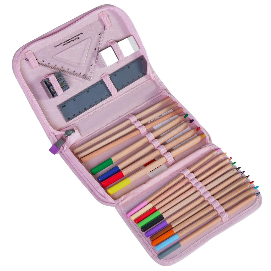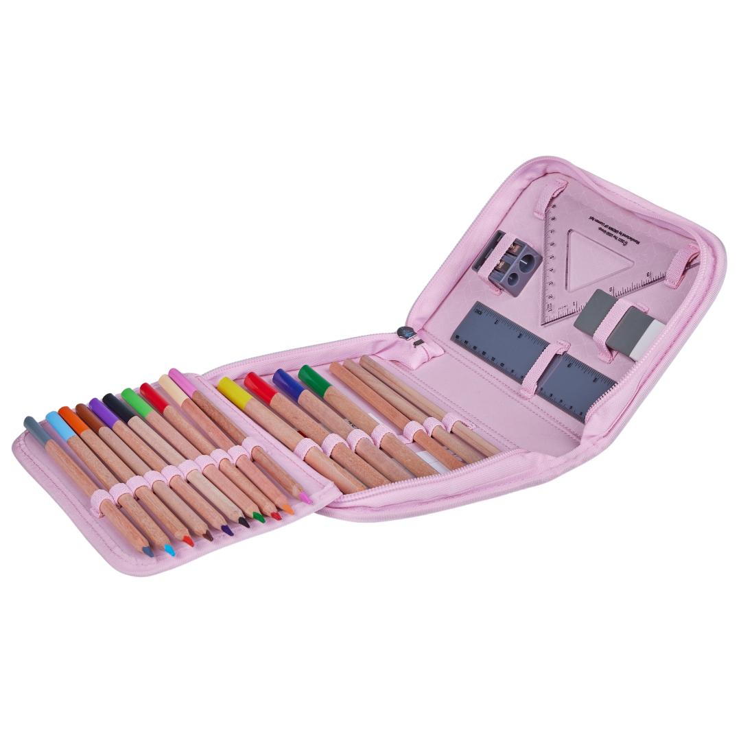 Penar echipat pentru școală: 2 creioane, 10 creioane colorate, 4 groase, radieră, ascuțitoare, riglă și echer; 14×20×4 cm, 0,5 L, material rPET, 6+.