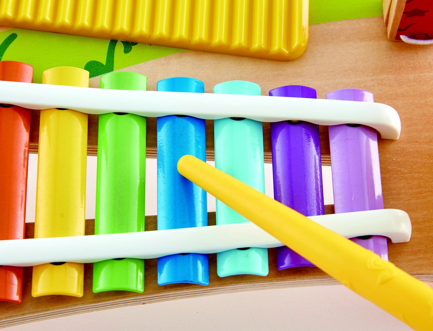 Fiecare instrument emite un sunet diferit, ajutând copilul să înțeleagă diferențele dintre tonalități și timbre. Sunetele sunt reglate special pentru a fi prietenoase cu urechile celor mici, evitând zgomotele deranjante.
