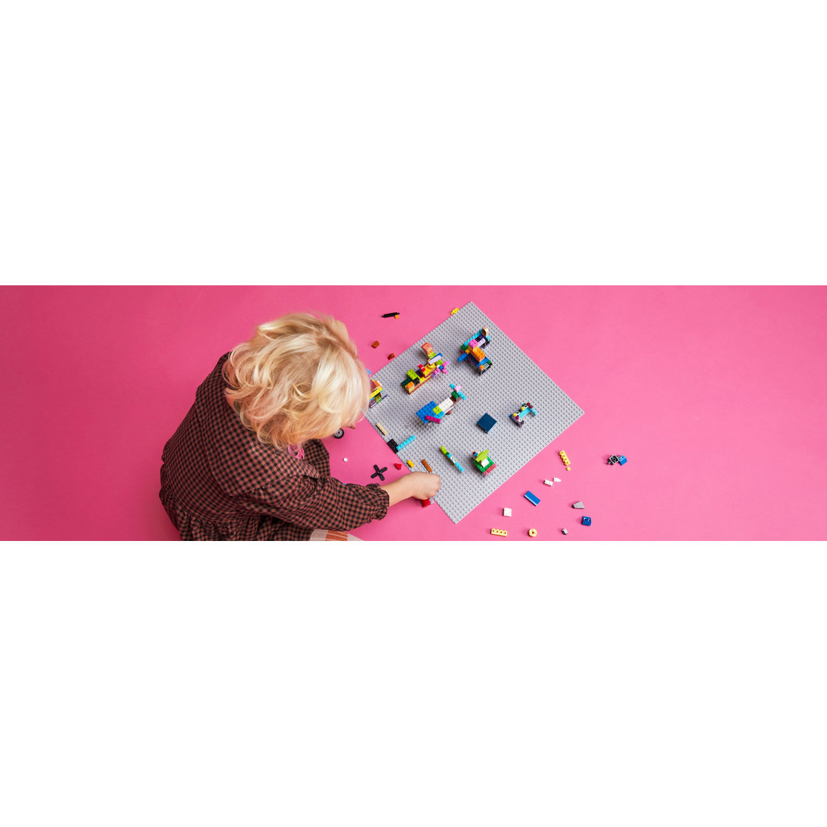 Se folosește ca bază pentru proiecte: copilul poate începe construcția direct pe placă, poate reorganiza scenele și poate muta creația mai ușor când vrea să o păstreze la vedere.