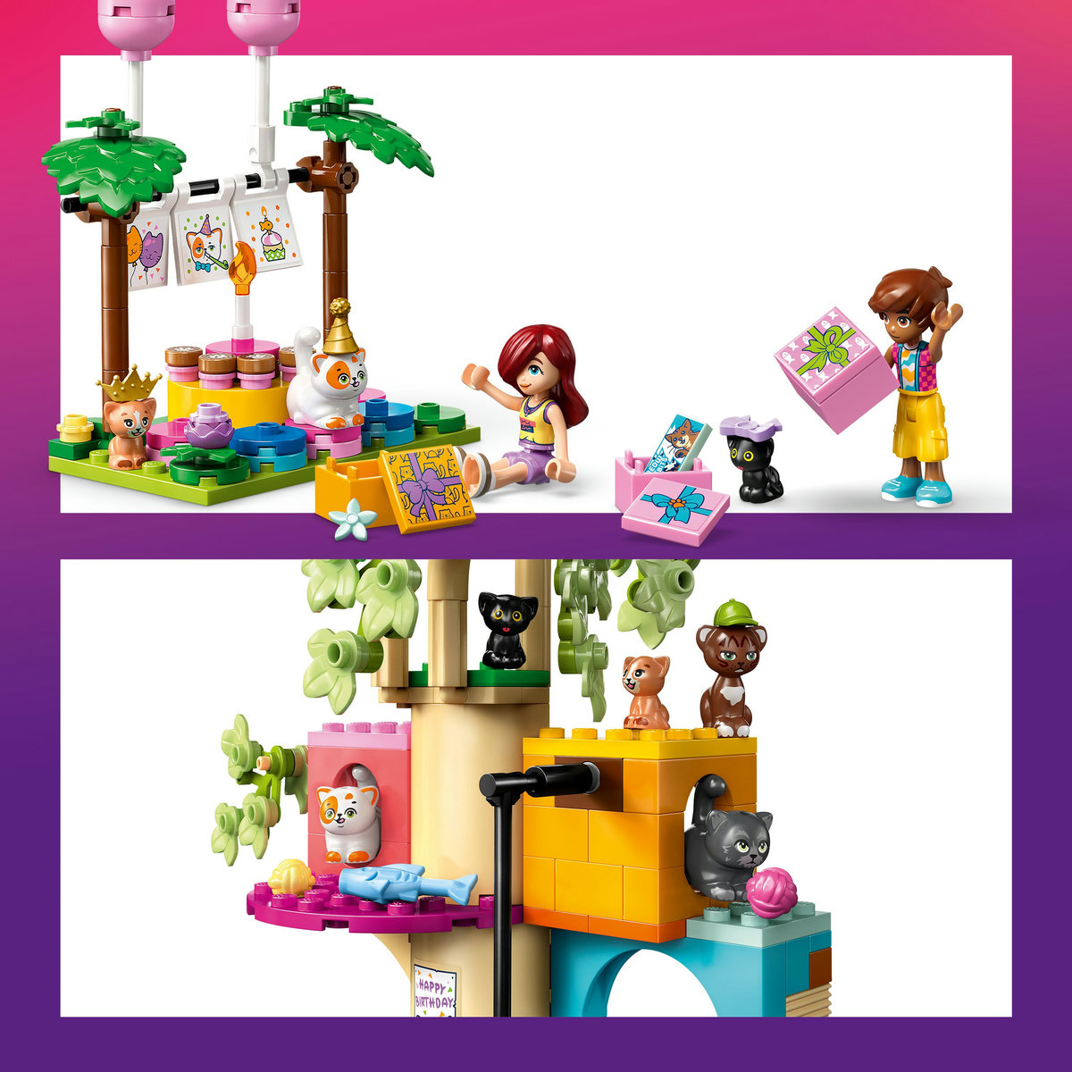 Setul LEGO Friends este recomandat pentru 6+ ani și conține 321 de piese. Tema este o petrecere pentru pisici, organizată într-o căsuță în copac, iar setul include 2 minipăpuși și 5 figurine pisică.