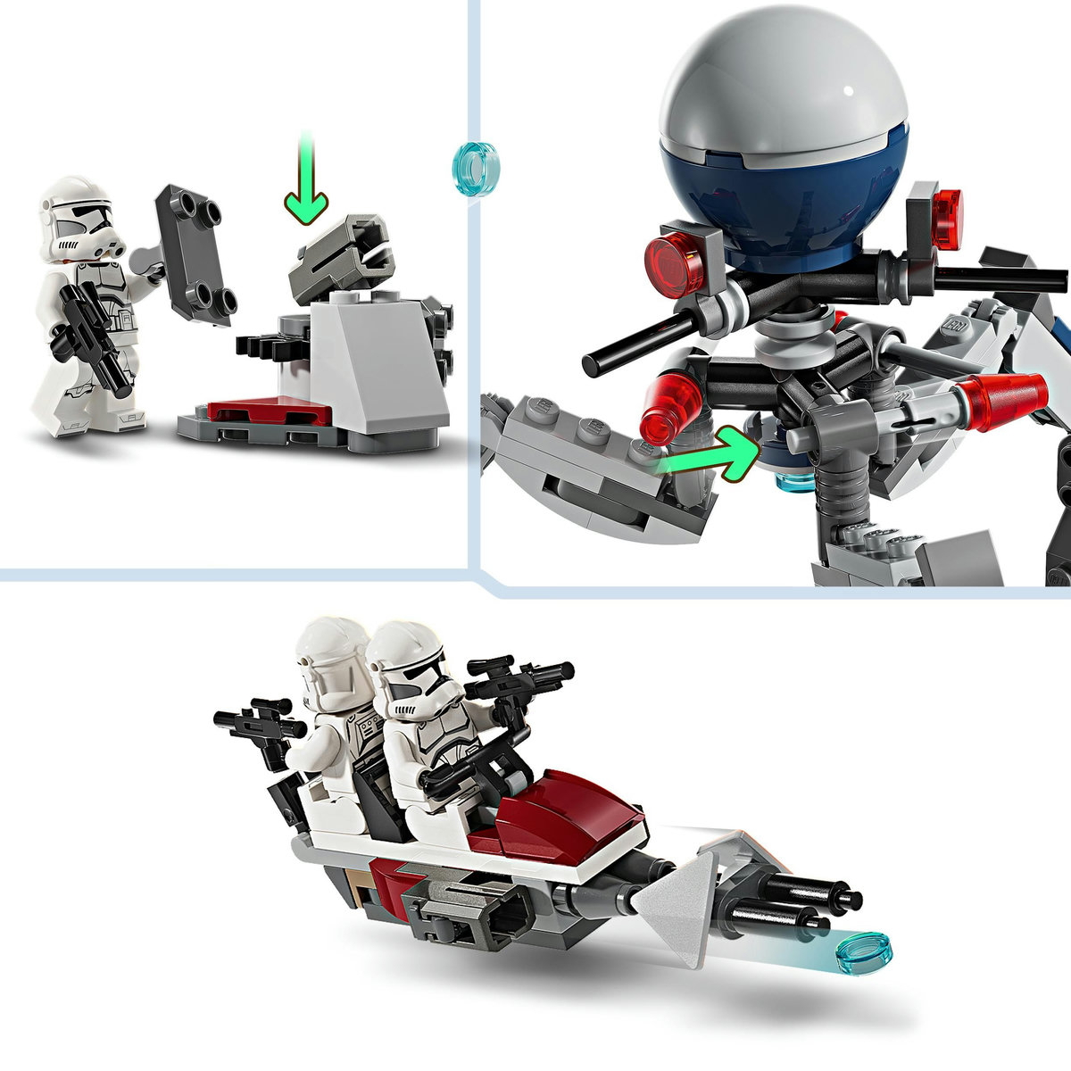 Acest set LEGO Star Wars include 4 minifigurine și 5 figurine: un Clone Shock Trooper, 3 Clone Trooper-i, 3 Superdroizi de luptă și 2 Droizi de luptă, plus arme emblematice. Setul conține o motocicletă rapidă care trage cu piroane, un speeder STAP construibil, un tri-droid cu 3 arme activate prin lovire și un post de apărare cu lansator.