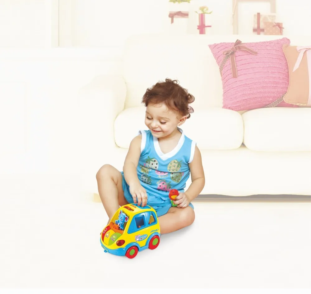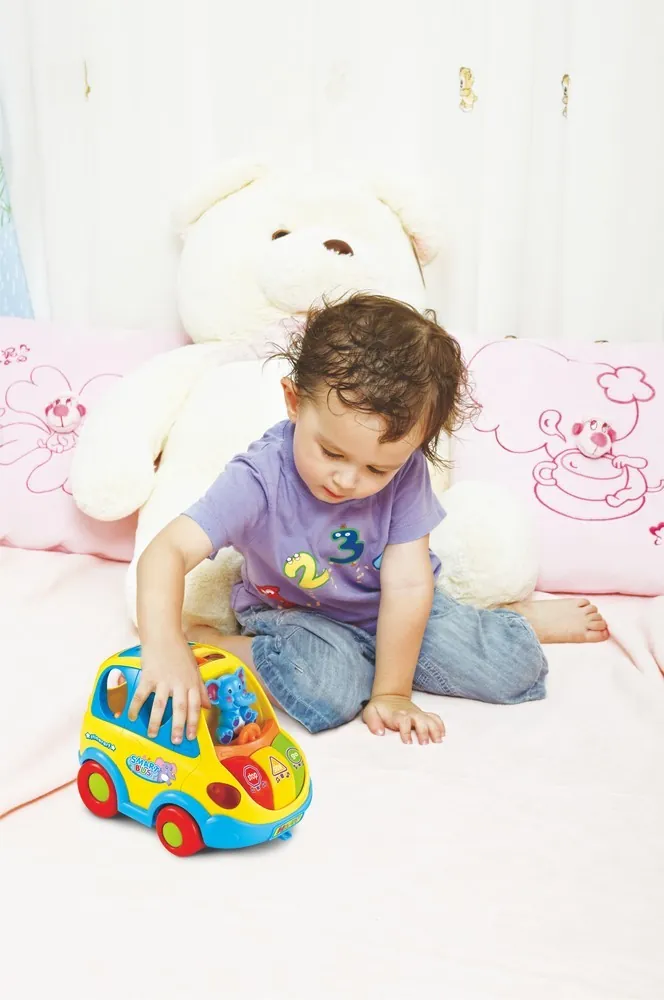 Masinuta animalutelor cu forme, lumini si sunete de la HolaToys va oferi copilului dumneavoastra momente pline de distractie si veselie, iar dumneavoastra, privindu-l, zambete. Formele diferite atrag privirile celui mic, starnindu-i curiozitatea si dorinta de a invata. Copilul poate umple masinuta cu diversele forme, sa o goleasca si sa inceapa din nou. Fiecare din forme reprezinta un animalut ce trebuie strans pentru a fi inserat in masinuta. De fiecare data cand o forma este introdusa in masinuta aceasta emite un sunet distinctiv. Jucarie vine dotata cu mecanism de miscare bump&go astfel se va plimba si nu se va impotmoli niciodata. Sunetele si luminile emise de catre aceasta ii starnesc curiozitatea, descoperind noi moduri de a se juca. Dezvolta perceptia vizuala si auditiva si coordonarea dintre maini si ochi. Formele speciale si culorile vii incurajeaza copilul sa exerseze si sa se joace stimuland astfel dezvoltarea individuala. Imaginile produsului sunt cu titlu de prezentare, culorile anumitor mici elemente pot varia. Produsul este recomandat de la varsta de 18 luni+. Functioneaza cu 3 baterii AA de 1.5v ce sunt incluse. Dimensiuni produs 20cm L x 15cm l x 14.5cm h.