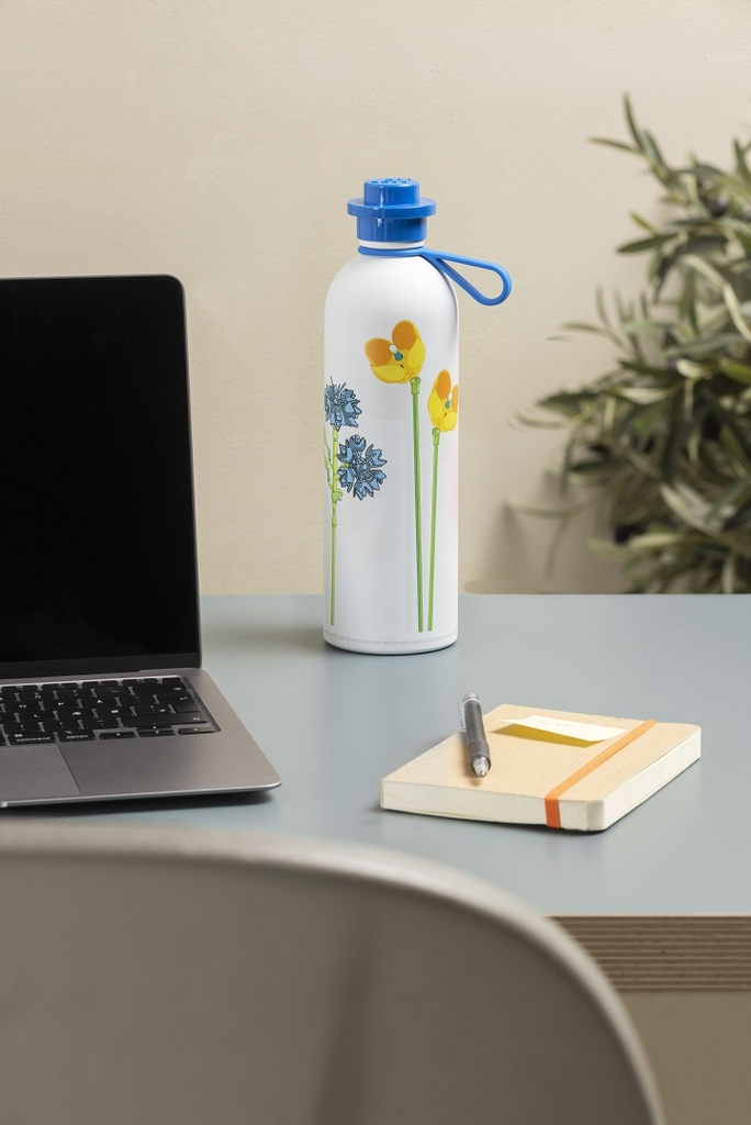 Sticlă reutilizabilă cu volum de 725 ml, cu design „Flori”. Potrivită pentru hidratare zilnică la școală, sport sau plimbări.